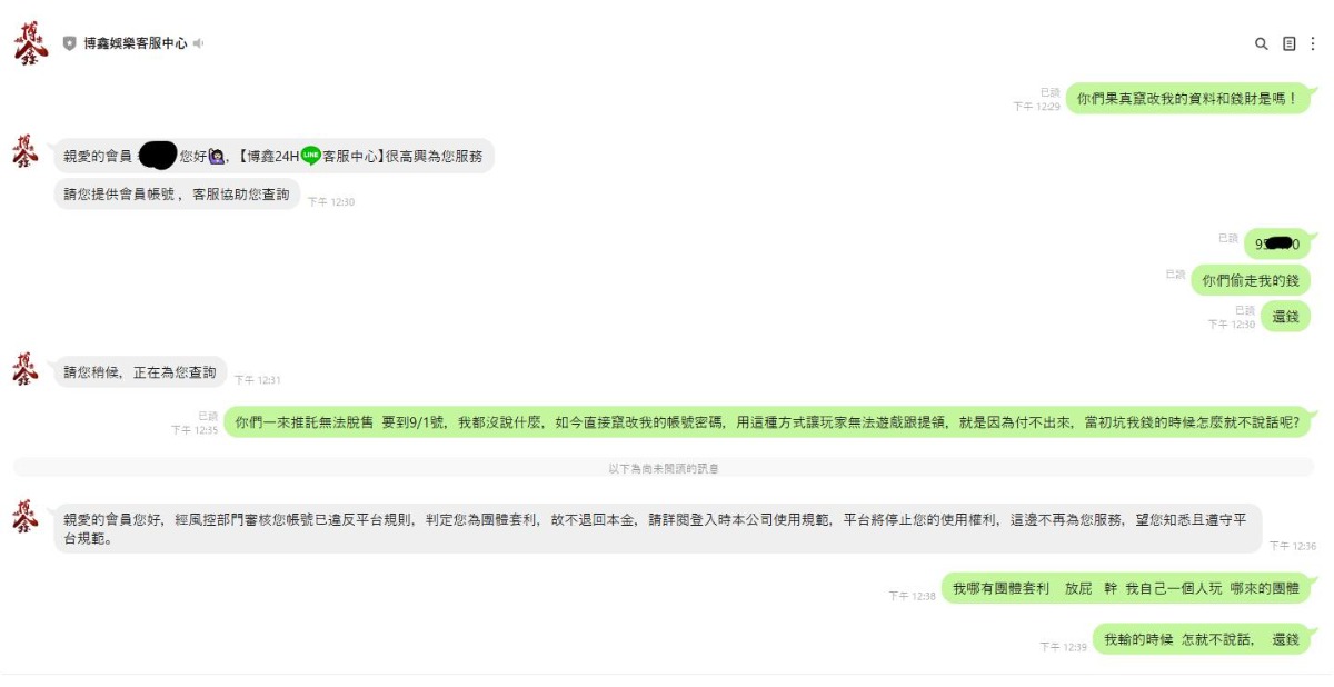 下面是客服的回覆截圖(自己看),不但沒幫忙,還丟一些完全沒根據的藉口來搪塞,什麼「違反套利行為」、「異常投注」——我根本就正常自己玩,哪來套利?