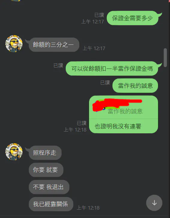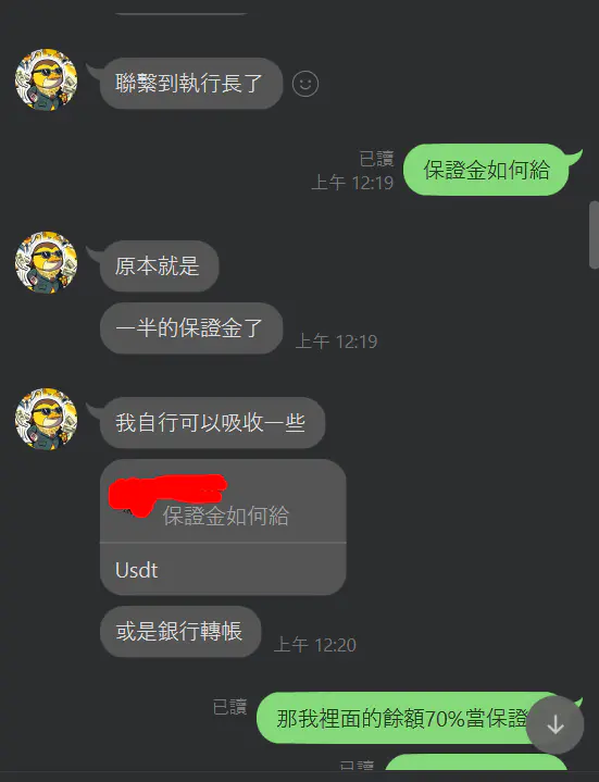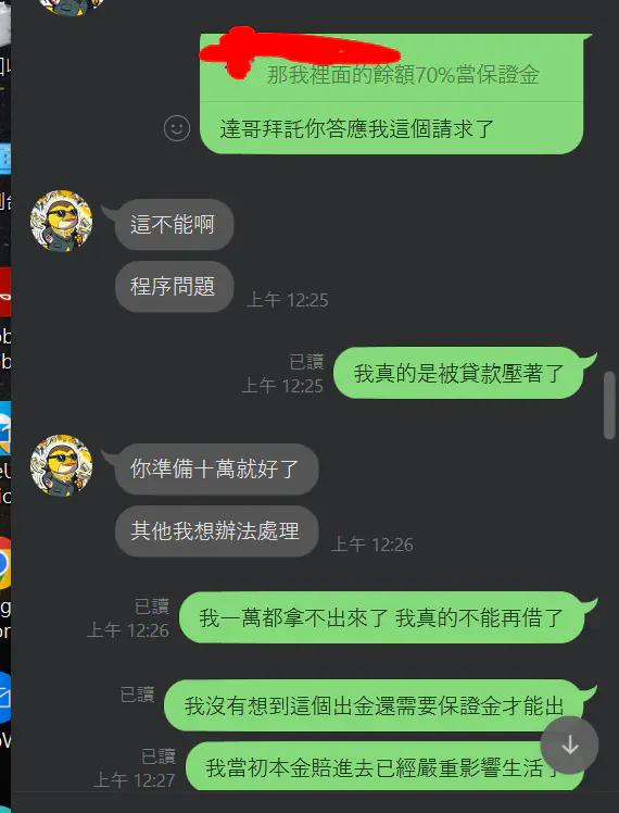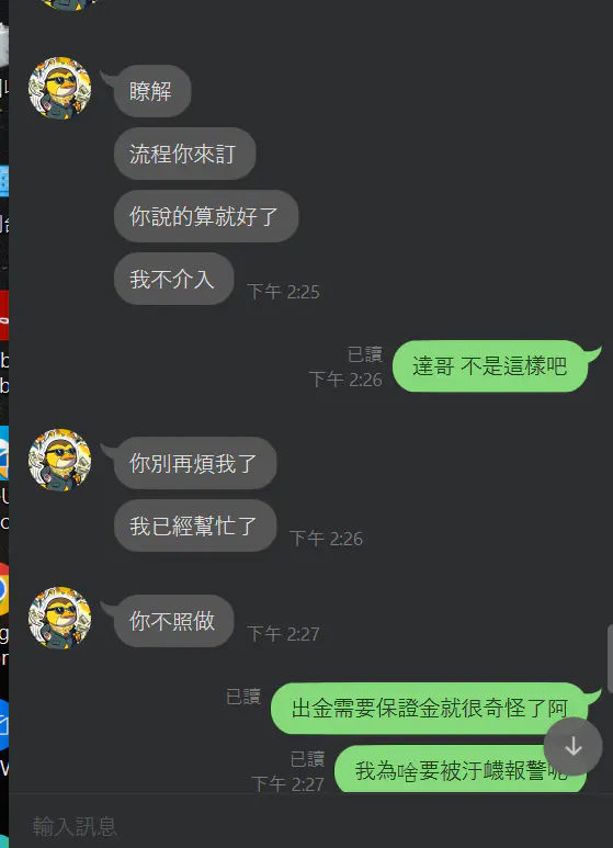 我氣到爆炸,馬上找那個垃圾代理達X來協助解決,他給我的回覆更扯:「需要繳交3分之1的保證金才可出金。」我第一次聽到這種鳥事,哪有出金還要先繳保證金的?給了之後也不一定能出,感覺就是綁架錢包的把戲。他還在那邊跟我扯:「我達哥名聲那麼大,怕你騙我保證金?」笑死人了,你名聲大?殊不知你還利用集資名義騙了不少人錢,這種垃圾真的有夠猖狂,表面上裝大咖,背地裡就是娛樂城詐騙的幫兇。