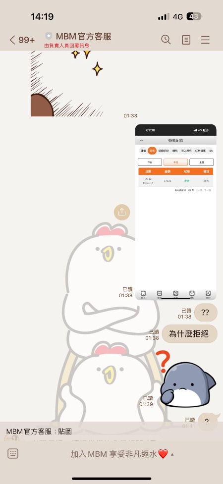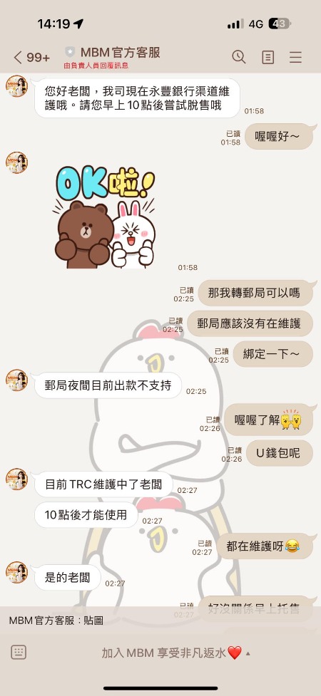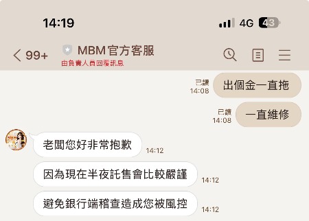 MBM娛樂城不出金真的扯,跟客服說要出金結果一直拖,還直接拒絕我脫售,理由永遠都是「銀行在維護」。我想說算了,那不然換郵局試試看,結果一樣不行。再改用U錢包還是被打回票,說什麼也在維護,根本就是在找藉口拖時間。