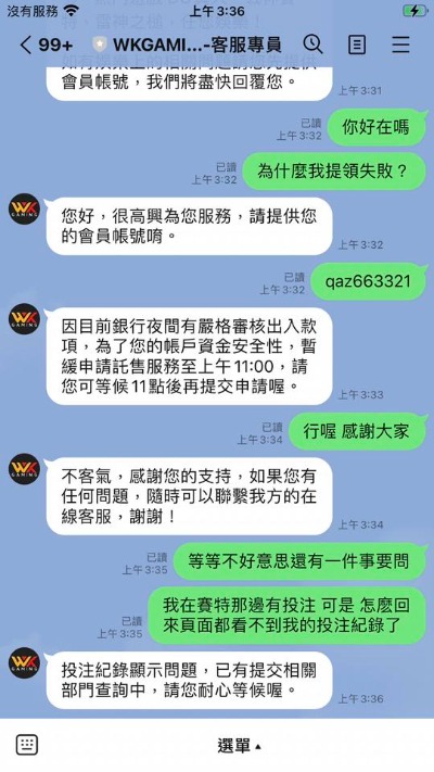 奉勸各位賭仔,眼睛真的要睜大一點,這種小錢都輸不起的娛樂城,擺明就是想騙錢的。賽特會異常?我看是他們的心比較異常吧!贏錢就說你違規,輸錢就裝死,真的是爛透了!以後看到WK娛樂城這幾個字,絕對要閃遠一點!別再傻傻被這種黑網騙了!