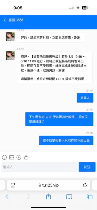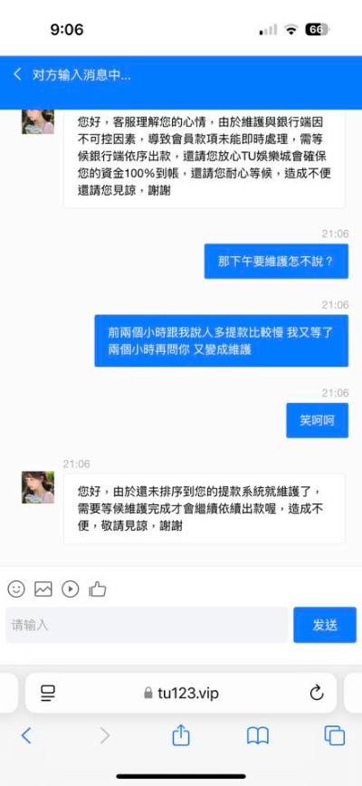 擺明了就是在拖延,根本只想坑玩家的錢,只准輸不准贏是不是?這種爛平台,爛透了!奉勸各位要玩線上娛樂城的,眼睛睜大一點,千萬別踩到TU娛樂城這個大雷!要玩還不如去