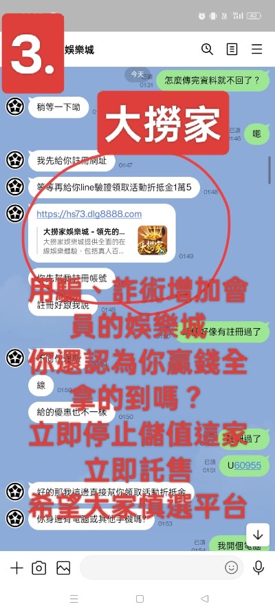奉勸各位玩家,五方娛樂城、大撈家娛樂城,這兩家娛樂城就是用盡各種騙術、詐術來吸引會員儲值。你以為你在這些平台贏錢真的能全數領到嗎?別傻了!他們的目的就是要騙你的錢進去,等到你想提款的時候,就會用各種理由拖延、刁難,甚至直接封鎖你的帳號,讓你血本無歸!